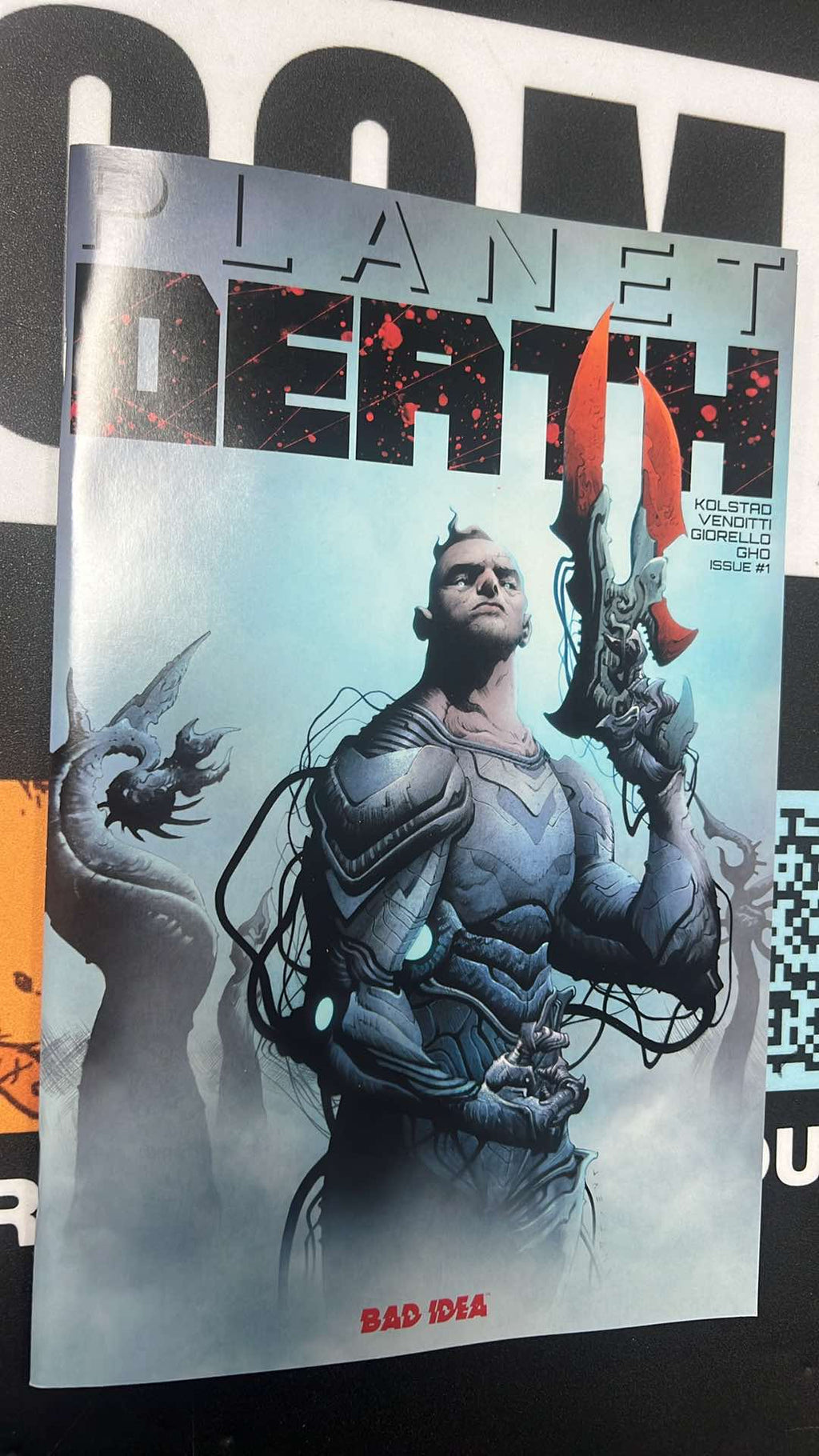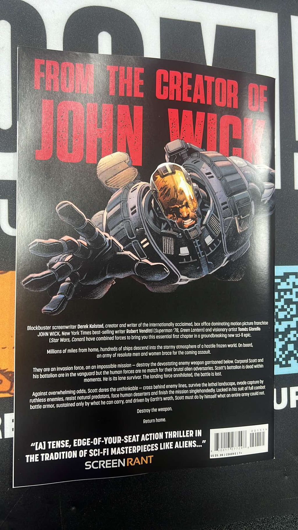 The explosive 48-page first issue of the record-breaking series premieres in a high end, deluxe prestige format! From the minds of blockbuster screenwriter Derek Kolstad — creator and writer of the box office dominating motion picture franchise JOHN WICK — and New York Times best-selling writer Robert Venditti (Superman ‘78, Green Lantern), along with artistic visionaries Tom s Giorello (Star Wars, Conan) and ten-time Eisner Award-winner Dave Stewart (Star Wars, Hellboy) comes a groundbreaking new sci-fi epic. Millions of miles from home, hundreds of ships descend into the stormy atmosphere of a hostile frozen world. On board, an army of resolute men and women brace for the coming assault. They are an invasion force, on an impossible mission — destroy the devastating enemy weapon garrisoned below. Corporal Scott and his battalion are in the vanguard but the human forces are no match for their brutal alien adversaries. Scott’s battalion is dead within moments. He is its lone survivor. The landing force annihilated, the battle is lost. Against overwhelming odds, Scott dares the unthinkable — cross behind enemy lines, survive the lethal landscape, evade capture by ruthless enemies, resist natural predators, face human deserters and finish the mission singlehandedly. Locked in his suit of full combat battle armor, sustained only by what he can carry, and driven by Earth’s wrath, Scott must do by himself what an entire army could not. Destroy the weapon. Return home.
