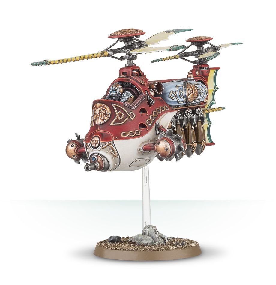 The sleek, heavily armoured Gyrobomber is the next evolutionary step in duardin aerial technology. Kept afloat by two rotor arrays and a dirigible balloon, the Gyrobomber is part Gyrocopter and part airship. Equipped with a formidable payload of eleven grudgebuster bombs and a nose mounted clattergun this miniature is a fantastic collector’s piece.