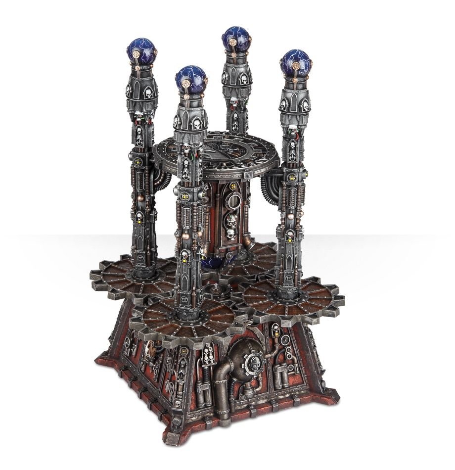 A brooding tower of pipes, cables and forgotten technology, the Void Shield Generator is the epitome of Mechanicus architecture. Able to project up to three void shields, it is an impressive defence system, aiding the warriors of the Imperium when hunkering down against alien assaults. The generator plinth houses an eclectic mix of old and new technology, from steam-driven cogs to plasma cores and beaten brass reactors, while at the corners of the structure stand four towers topped with energy globes that project the void shield around the building.